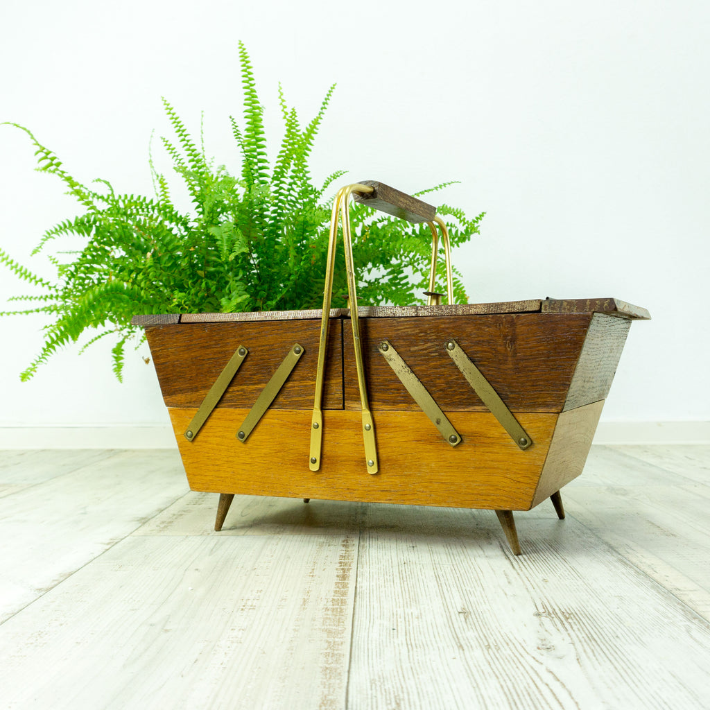 Great wooden midcentury SEWING or JEWELRY BOX with metal handle in cantilever style. This neat vintage beauty was manufactured in the 1960s of solid oak wood in light and dark brown coloring and beautiful grain, small tapered wooden feet. Accordion mechanism to open the box and its three compartments, one with removable subdivided wooden compartment. This versatile midcentury piece is not only the perfect place to store all your odds and ends or even your jewelry, it is also a wonderful, unique gift to a beloved person!