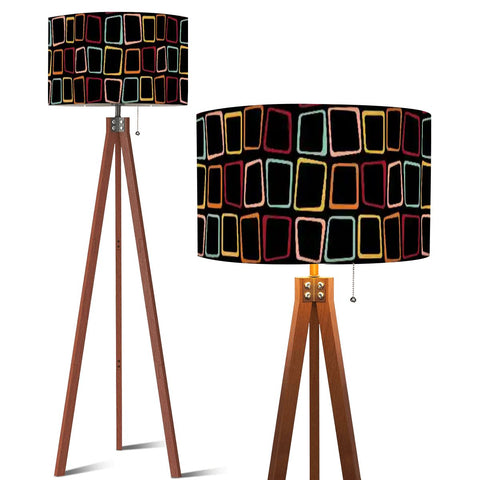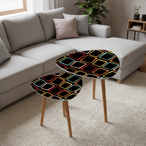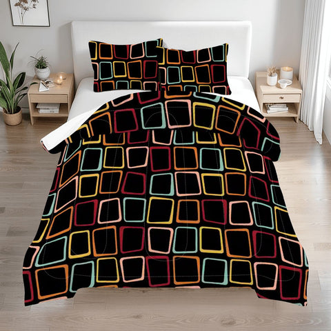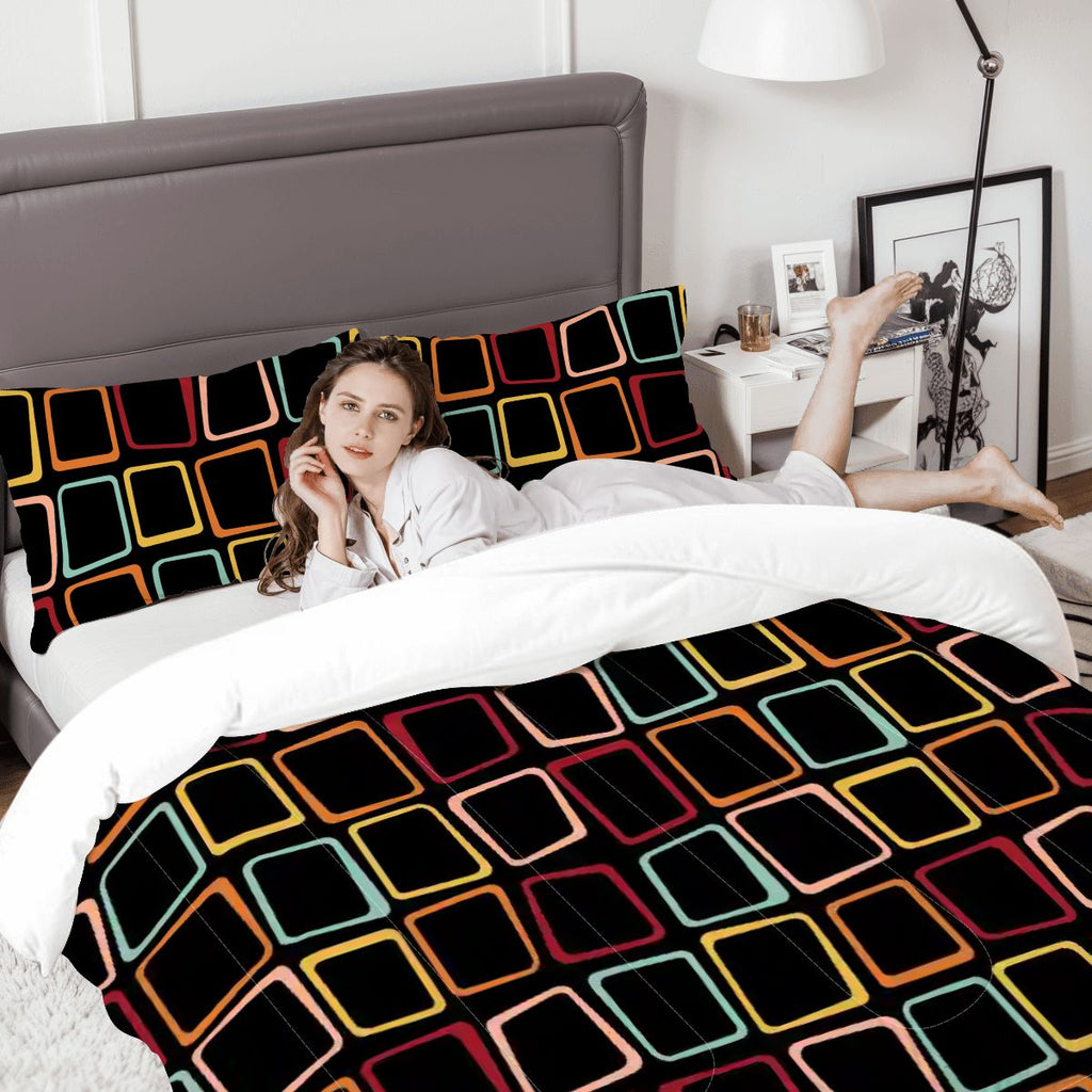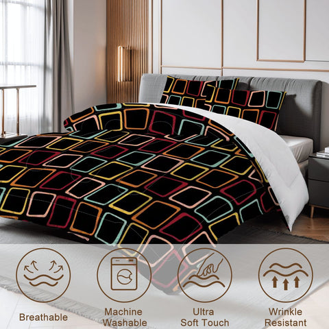 Groovy 70s retro style in black with a yellow, orange, red, and blue pattern - 3pc Reversible Luxury Microfiber Queen Size Bedding.