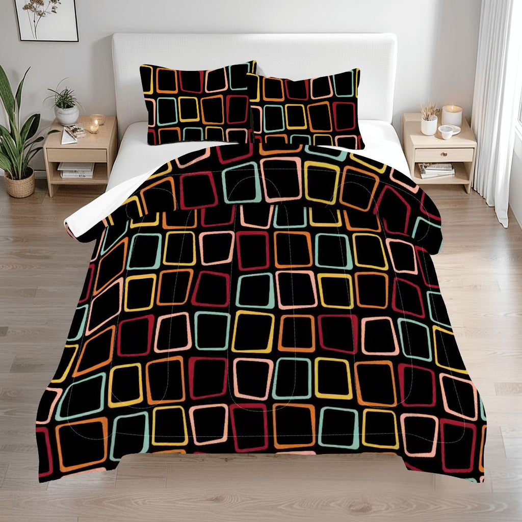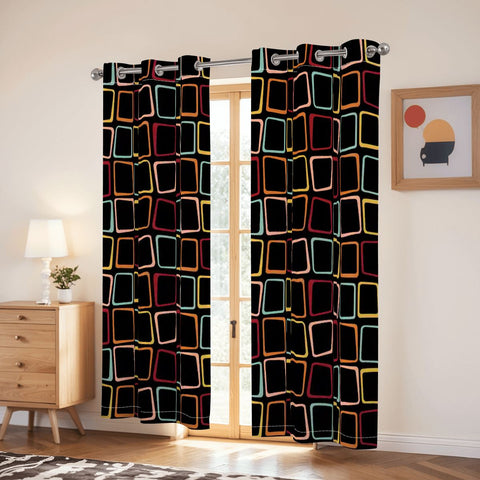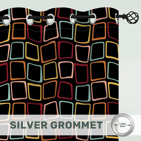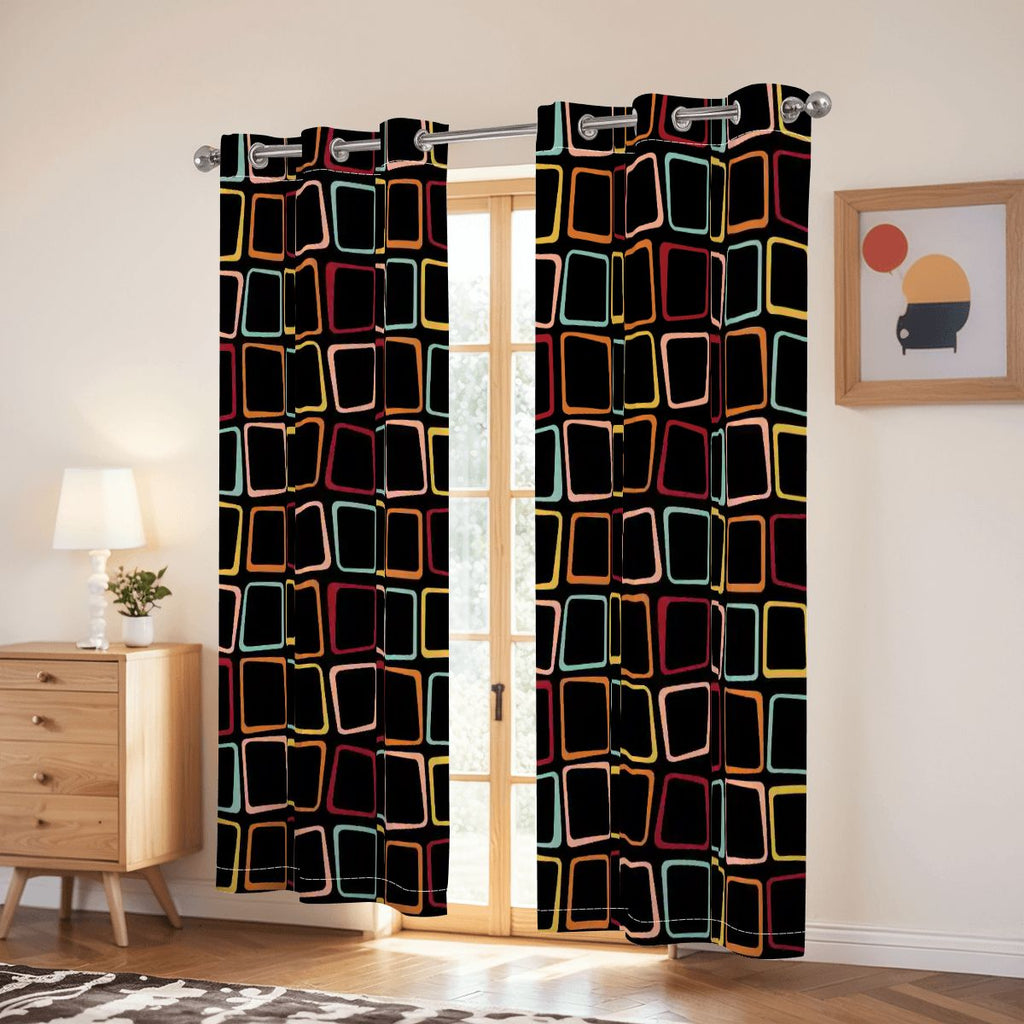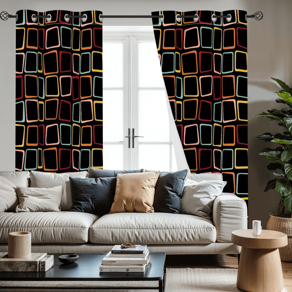 Black 70s Midcentury Blackout Curtains: Retro Squares Design Panels
