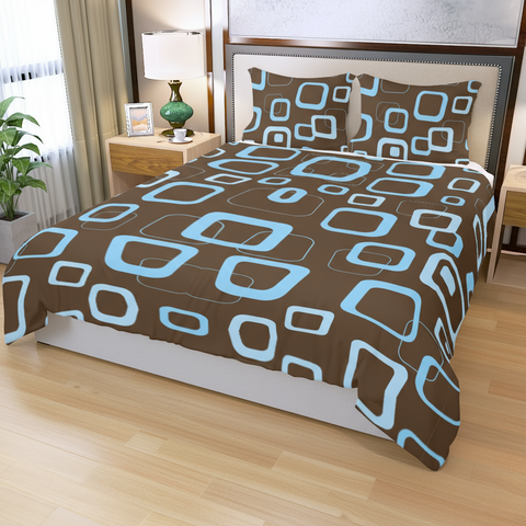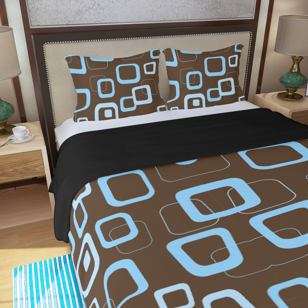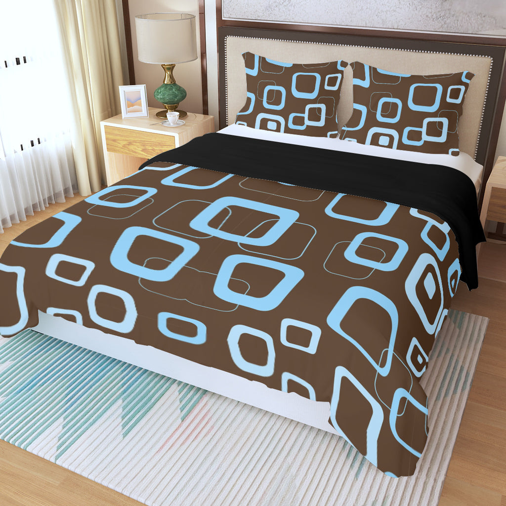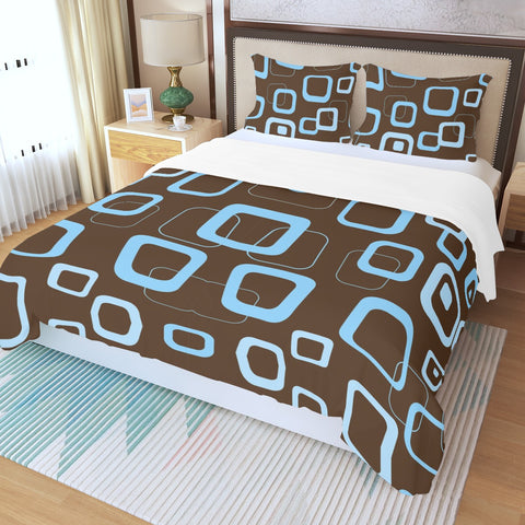 Mocha Brown Blue Retro 3-Piece Duvet Bedding Set, Midcentury Bed Linen