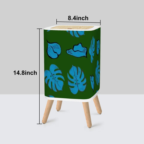 Retro 70s Square Small Trash Can with Lid, Dark Green with Blue Leaves