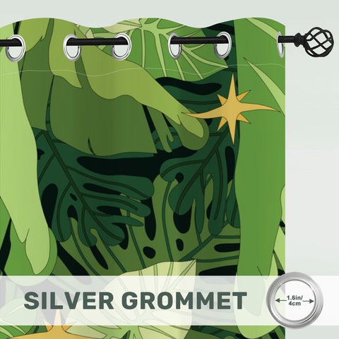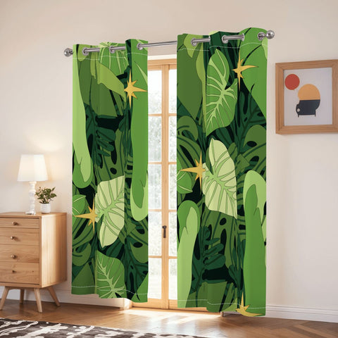 Retro Monstera Leaf Blackout Curtains: 70s Green Floral Midcentury Drapes