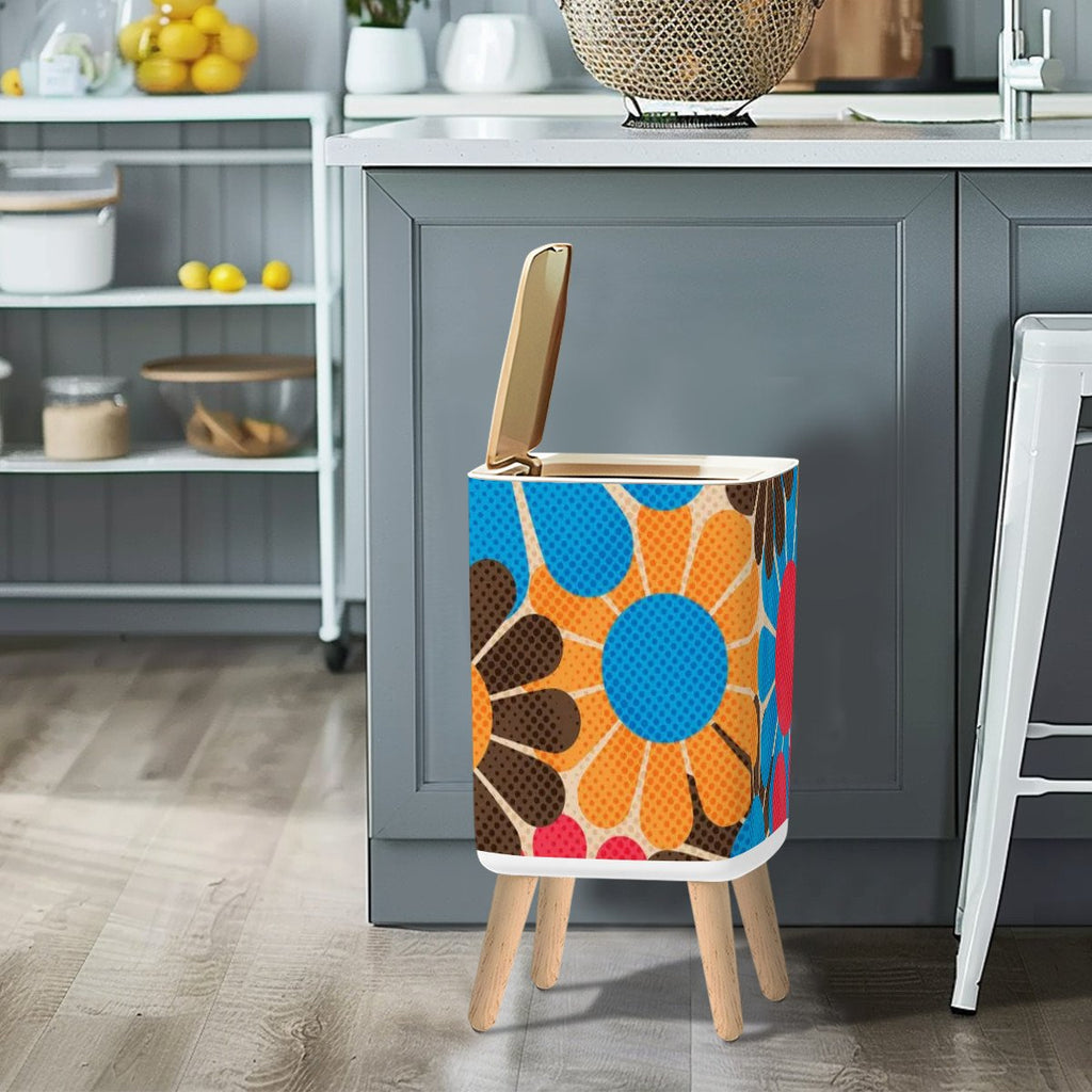 Retro Nordic Square Small Trash Can with Lid, 1970s Flowers Blue Red Brown Yellow