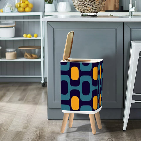 Scandi Square Small Trash Can with Lid, 1970s Blue Curry Yellow Geometric
